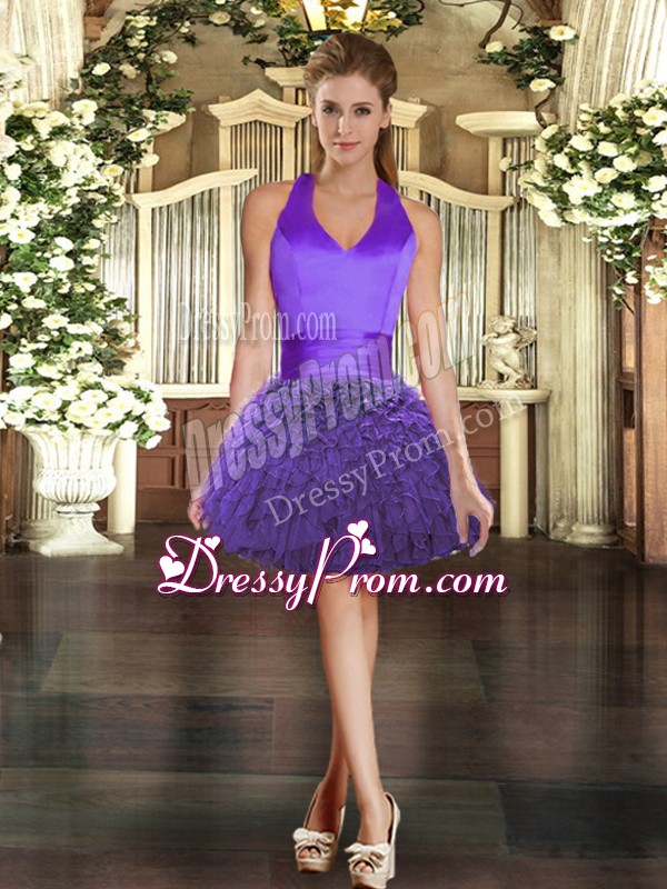 Neckline : Halter topShown Color : PurpleSilhouette : Ball GownsSleeve Length : sleevelessHemline : mini lengthBack Detail : Lace upFabric : OrganzaEmbellishment : RufflesOccasion : Prom,PartySeason : Spring,Summer,Fall
