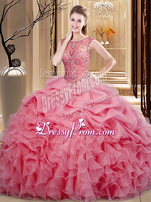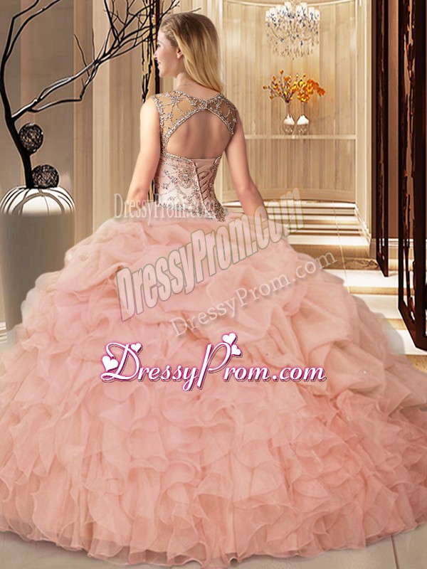 Neckline : ScoopShown Color : Pink Silhouette : Ball GownsSleeve Length : sleevelessHemline : floor lengthBack Detail : Lace upFabric : OrganzaEmbellishment : Beading,Ruffles,Pick UpsOccasion : Sweet 16,QuinceaneraSeason : Spring,Summer,Fall,Winter
