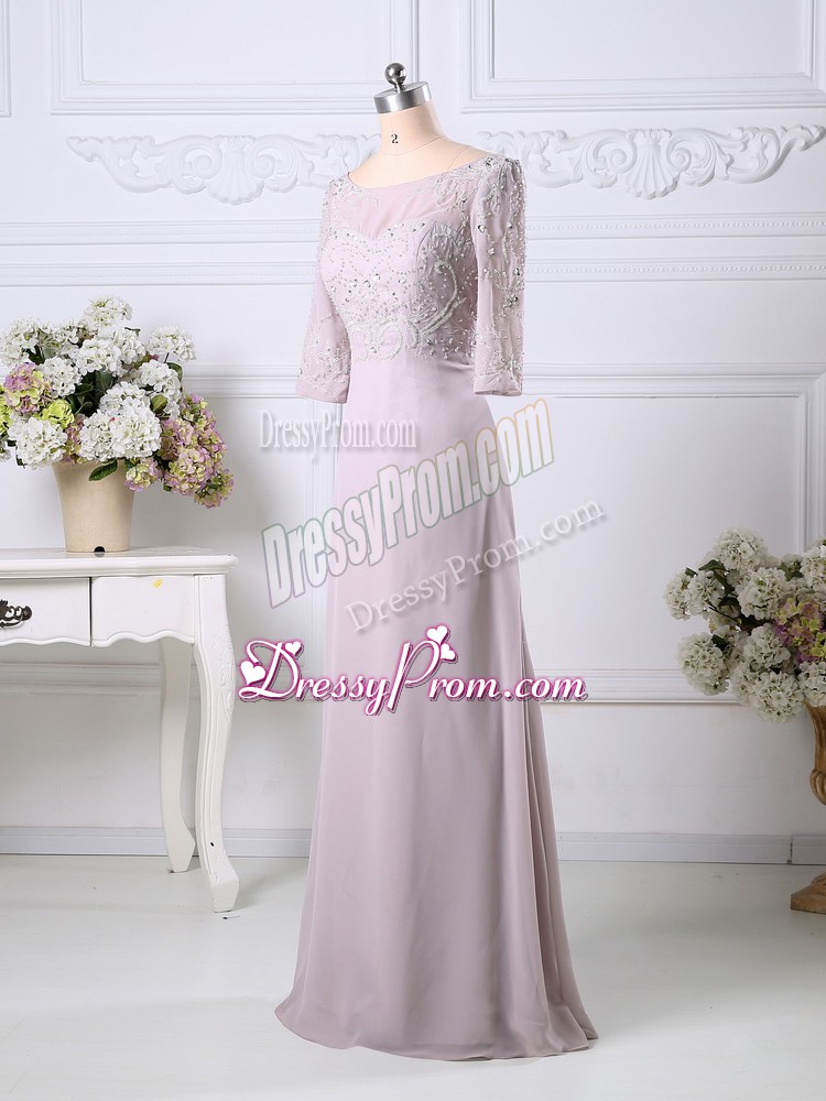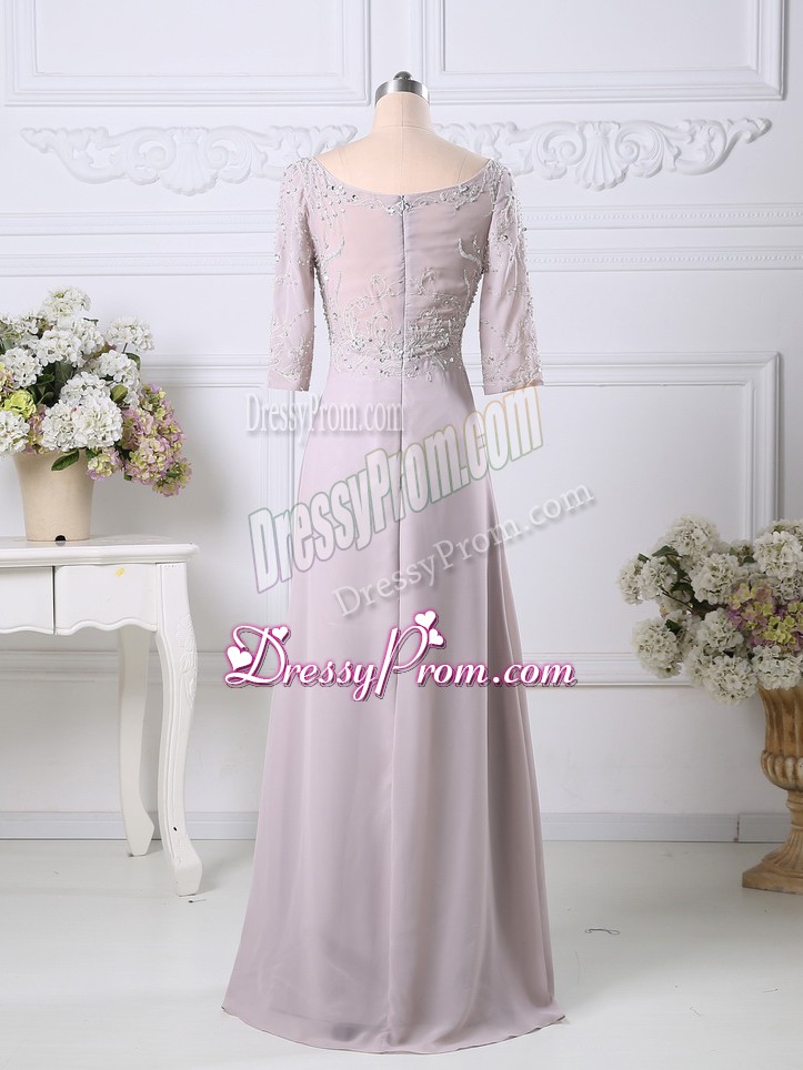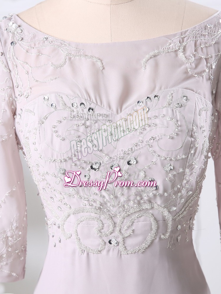 Neckline : ScoopShown Color : Pink Silhouette : EmpireSleeve Length : 3|4 length sleeveHemline : floor lengthBack Detail : ZipperFabric : ChiffonEmbellishment : Beading,EmbroideryOccasion : Prom,Party,Military BallSeason : Spring,Summer,Fall,Winter