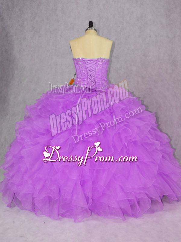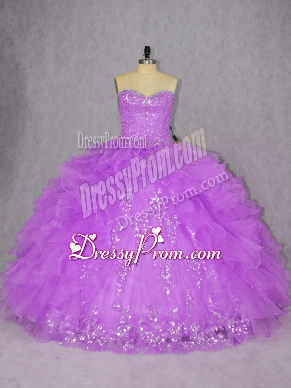 Neckline : SweetheartShown Color : PurpleSilhouette : Ball GownsSleeve Length : sleevelessHemline : floor lengthBack Detail : Lace upFabric : OrganzaEmbellishment : Appliques,RufflesOccasion : Sweet 16,QuinceaneraSeason : Spring,Summer,Fall,Winter