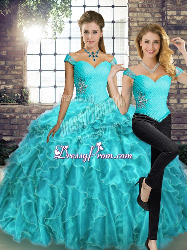 Neckline : Off the shoulder Shown Color : Aqua Blue Silhouette : Two Pieces Sleeve Length : sleeveless Back Detail : Lace up Fabric : Organza Embellishment : Beading,Ruffles Occasion : Military Ball,Sweet 16,Quinceanera Season : Spring,Summer,Fall,Winter