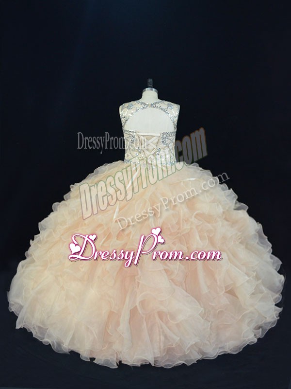 Neckline : ScoopShown Color : ChampagneSilhouette : Ball GownsSleeve Length : sleevelessHemline : floor lengthBack Detail : Lace upFabric : OrganzaEmbellishment : Beading,RufflesOccasion : Sweet 16,QuinceaneraSeason : Spring,Summer,Fall,Winter