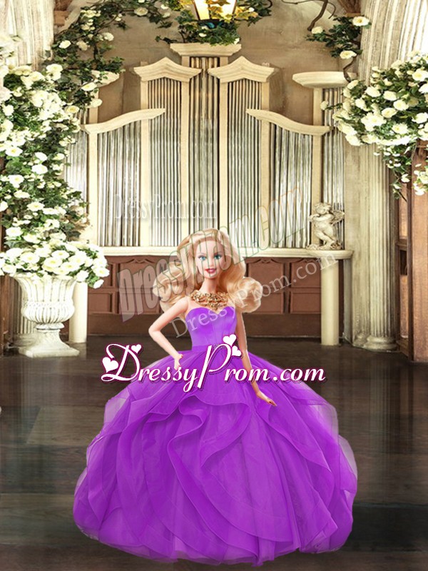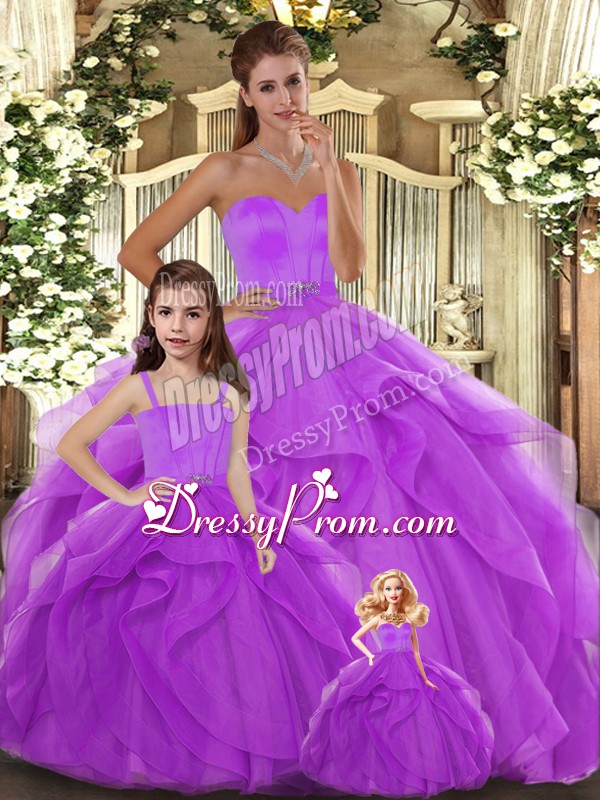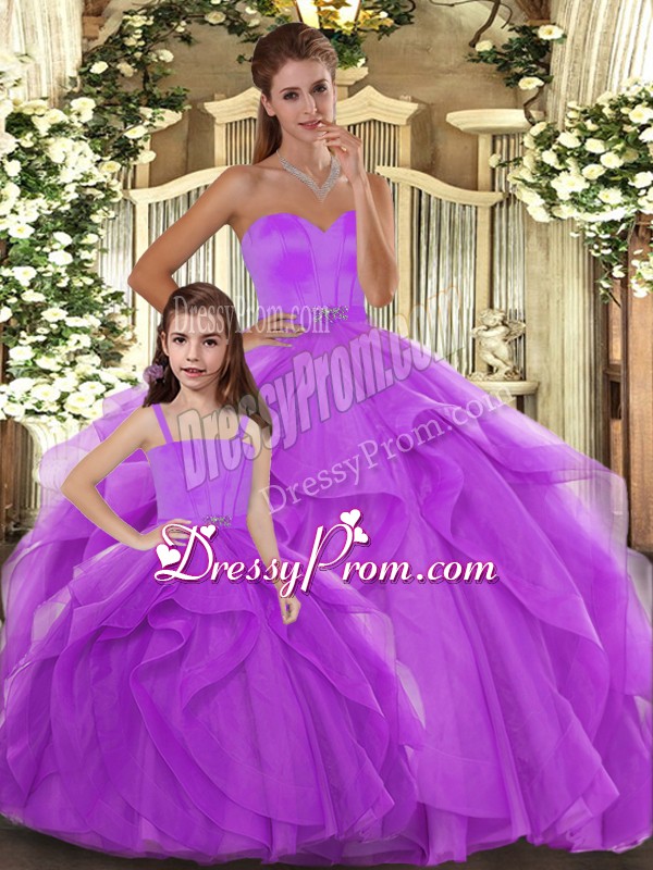 Neckline : SweetheartShown Color : LilacSilhouette : Ball GownsSleeve Length : sleevelessHemline : floor lengthBack Detail : Lace upFabric : TulleEmbellishment : Beading,RufflesOccasion : Sweet 16,QuinceaneraSeason : Spring,Summer,Fall,Winter
