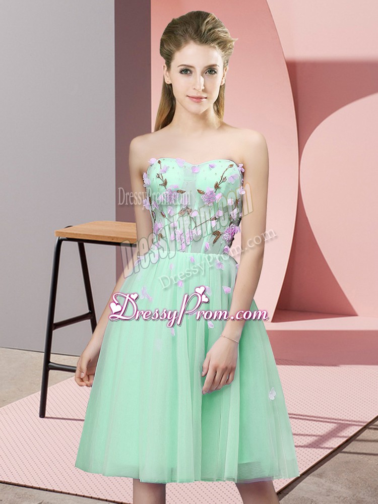 Neckline : SweetheartShown Color : Apple GreenSilhouette : EmpireSleeve Length : sleevelessHemline : knee lengthBack Detail : Lace upFabric : TulleEmbellishment : AppliquesOccasion : Wedding PartySeason : Spring,Summer,Fall