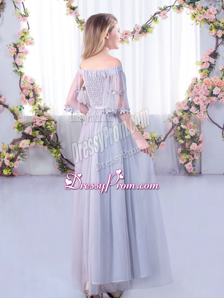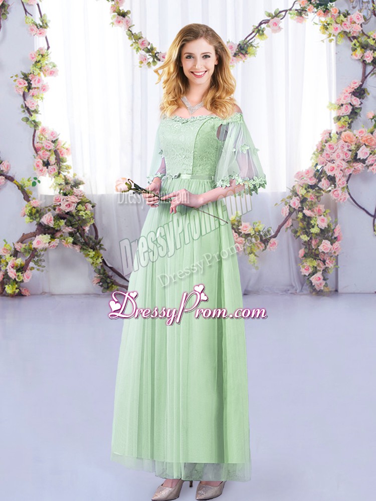 Neckline : Off the shoulder Shown Color : Apple Green Silhouette : Empire Sleeve Length : half sleeves Hemline : floor length Back Detail : Side zipper Fabric : Tulle Embellishment : Lace,Belt Occasion : Wedding Party Season : Spring,Summer,Fall,Winter