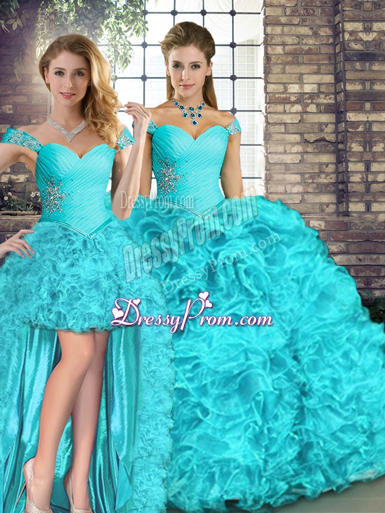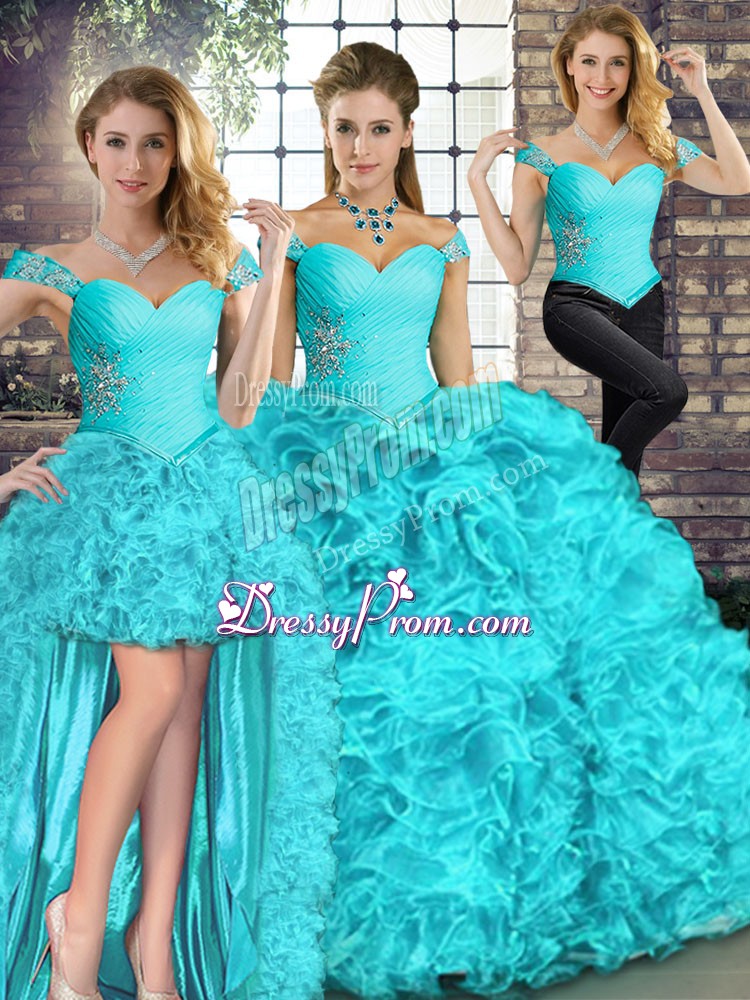 Neckline : Off the shoulder Shown Color : Aqua Blue Silhouette : Three Pieces Sleeve Length : sleeveless Hemline : floor length Back Detail : Lace up Fabric : Organza Embellishment : Beading,Ruffles Occasion : Military Ball,Sweet 16,Quinceanera Season : Spring,Summer,Fall,Winter