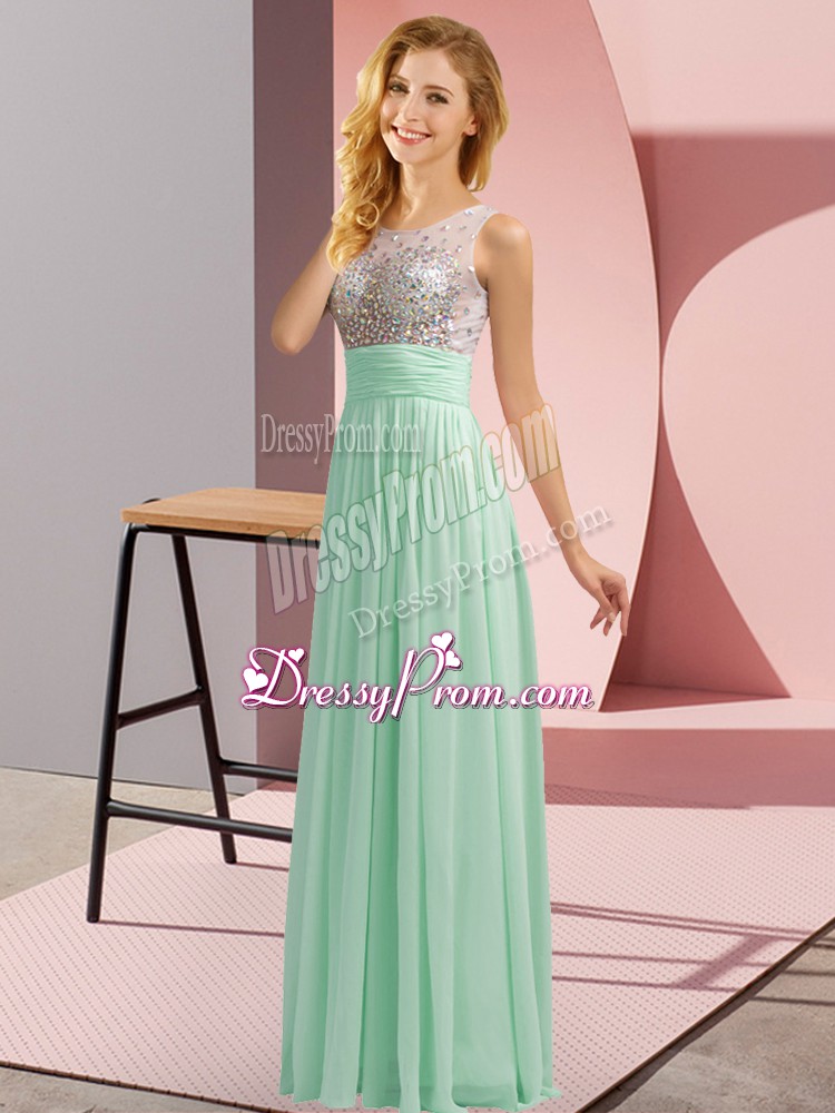 Neckline : ScoopShown Color : Apple GreenSilhouette : EmpireSleeve Length : sleevelessHemline : floor lengthBack Detail : Side zipperFabric : ChiffonEmbellishment : BeadingOccasion : Wedding PartySeason : Spring,Summer,Fall,Winter