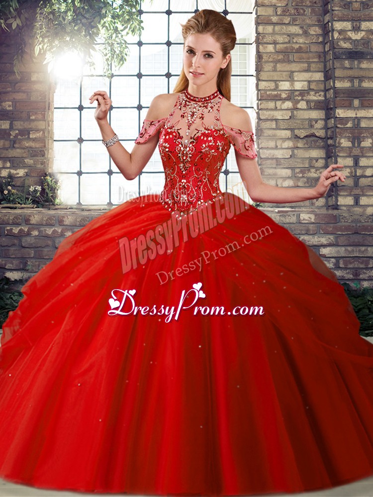 Neckline : Halter topShown Color : RedSilhouette : Ball GownsSleeve Length : sleevelessBack Detail : Lace upFabric : TulleEmbellishment : Beading,Pick UpsOccasion : Military Ball,Sweet 16,QuinceaneraSeason : Spring,Summer,Fall,Winter
