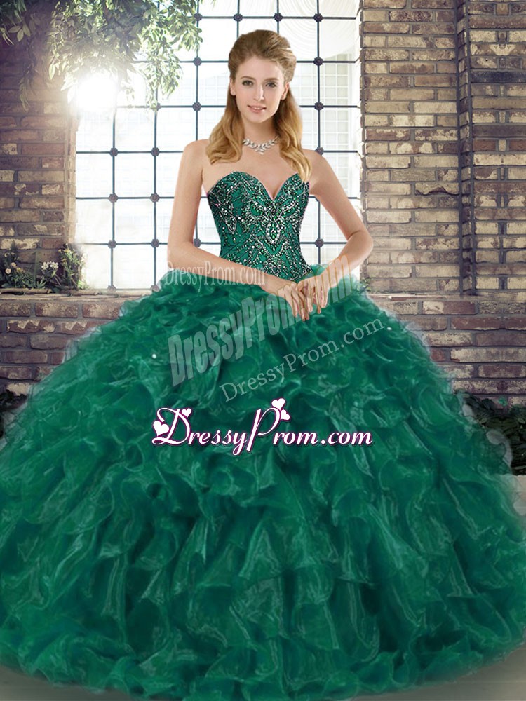 Neckline : SweetheartShown Color : GreenSilhouette : Ball GownsSleeve Length : sleevelessHemline : floor lengthBack Detail : Lace upFabric : OrganzaEmbellishment : Beading,RufflesOccasion : Military Ball,Sweet 16,QuinceaneraSeason : Spring,Summer,Fall,Winter