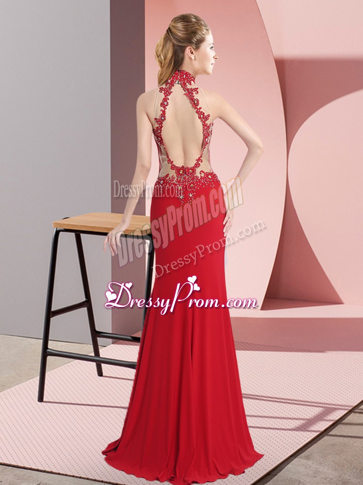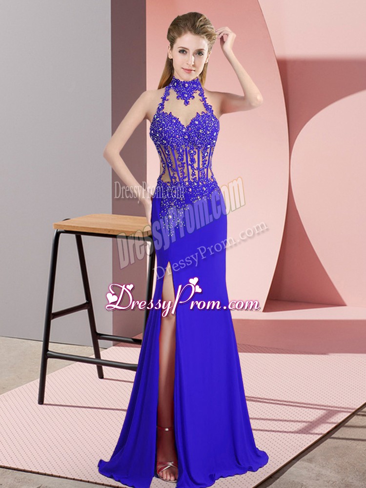 Neckline : Halter topShown Color : Royal BlueSilhouette : Column/SheathSleeve Length : sleevelessHemline : floor lengthBack Detail : BacklessFabric : ChiffonEmbellishment : Lace,AppliquesOccasion : Prom,Party,Military BallSeason : Spring,Summer,Fall,Winter