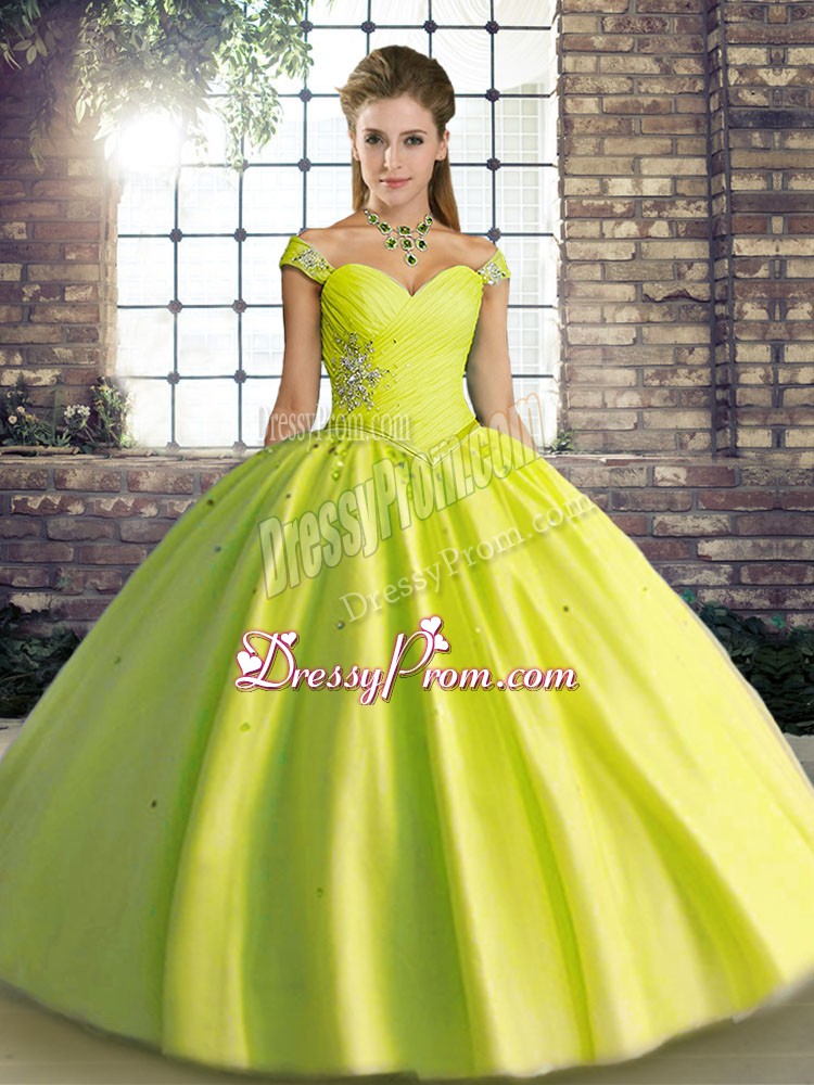 Neckline : Off the shoulderShown Color : Yellow GreenSilhouette : Ball GownsSleeve Length : sleevelessHemline : floor lengthBack Detail : Lace upFabric : TulleEmbellishment : BeadingOccasion : Military Ball,Sweet 16,QuinceaneraSeason : Spring,Summer,Fall,Winter