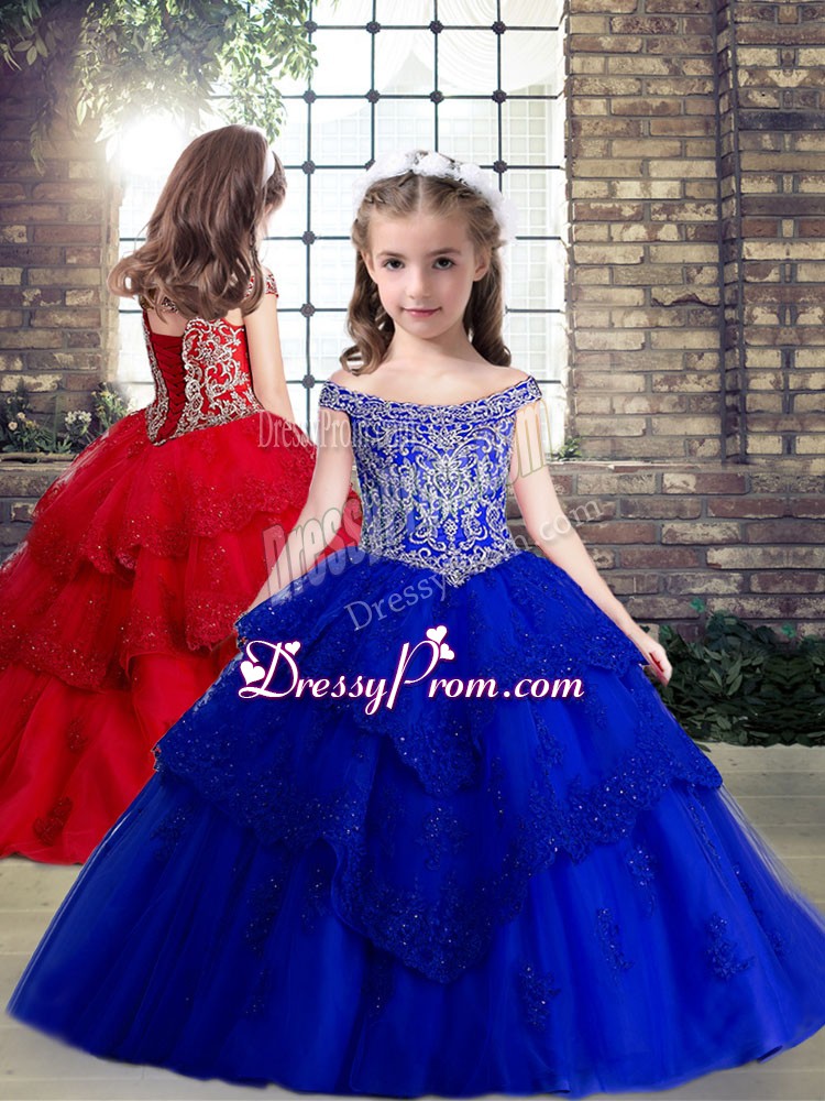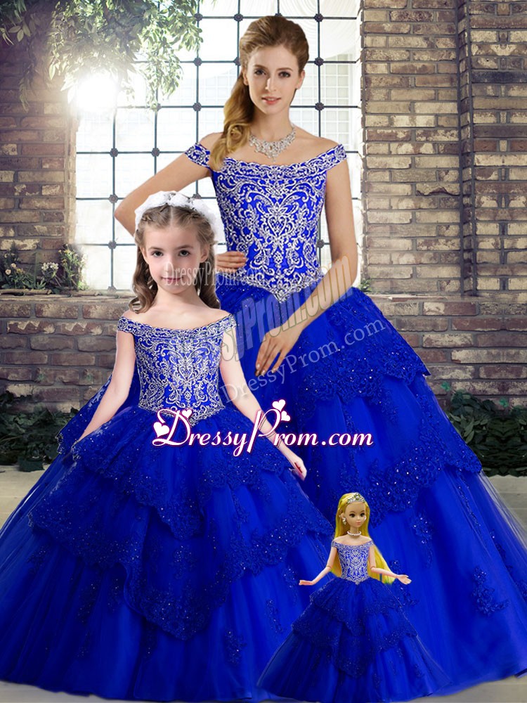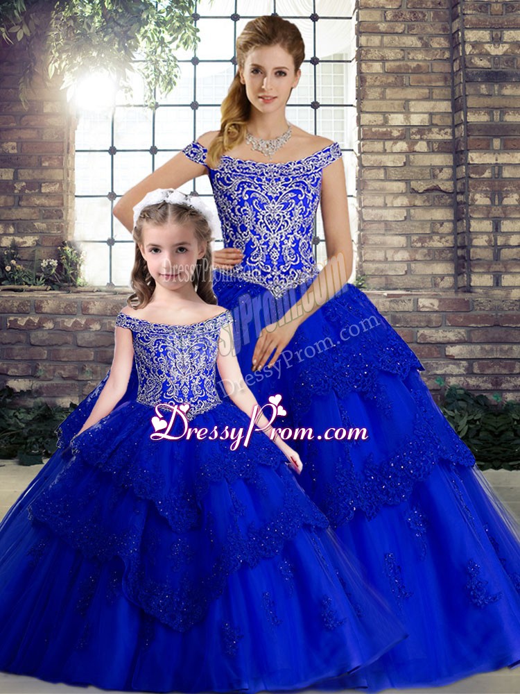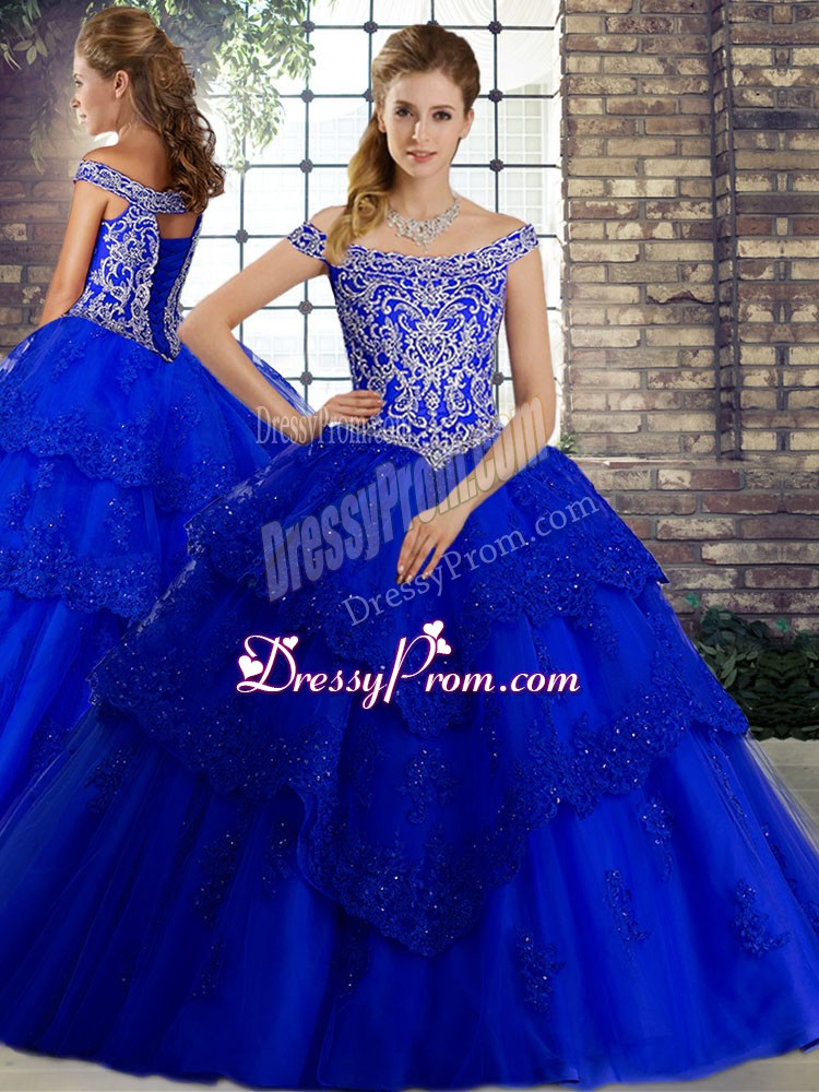 Gorgeous Tulle Off The Shoulder Sleeveless Brush Train Lace Up Beading and Lace Quince Ball Gowns in Royal Blue