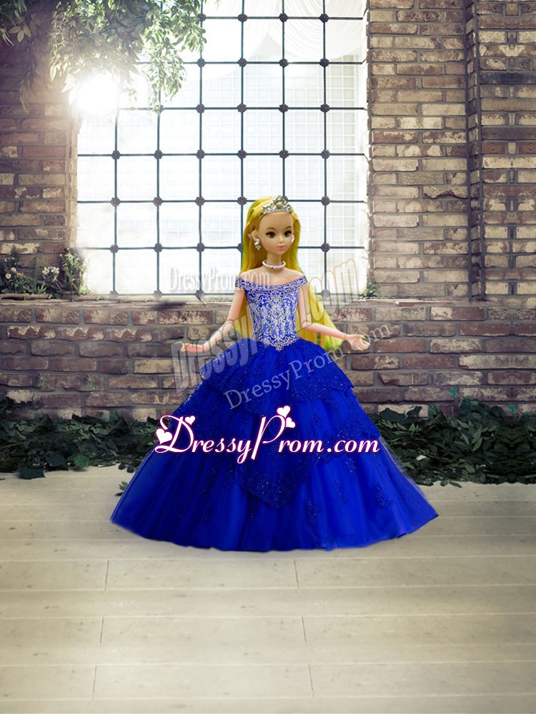 Neckline : Off the shoulder Shown Color : Royal Blue Silhouette : Ball Gowns Sleeve Length : sleeveless Back Detail : Lace up Fabric : Tulle Embellishment : Beading,Lace Occasion : Military Ball,Sweet 16,Quinceanera Season : Spring,Summer,Fall,Winter