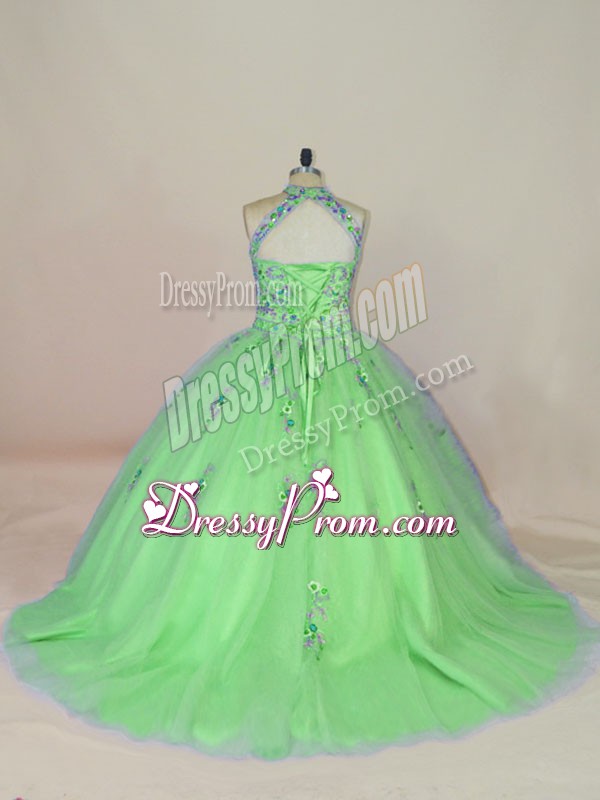 Neckline : Halter top Shown Color : Spring Green Silhouette : Ball Gowns Sleeve Length : sleeveless Back Detail : Lace up Fabric : Tulle Embellishment : Appliques,Embroidery Occasion : Sweet 16,Quinceanera Season : Spring,Summer,Fall,Winter