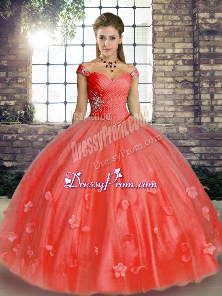 Neckline : Off the shoulderShown Color : Watermelon RedSilhouette : Ball GownsSleeve Length : sleevelessHemline : floor lengthBack Detail : Lace upFabric : TulleEmbellishment : Beading,AppliquesOccasion : Military Ball,Sweet 16,QuinceaneraSeason : Spring,Summer,Fall,Winter