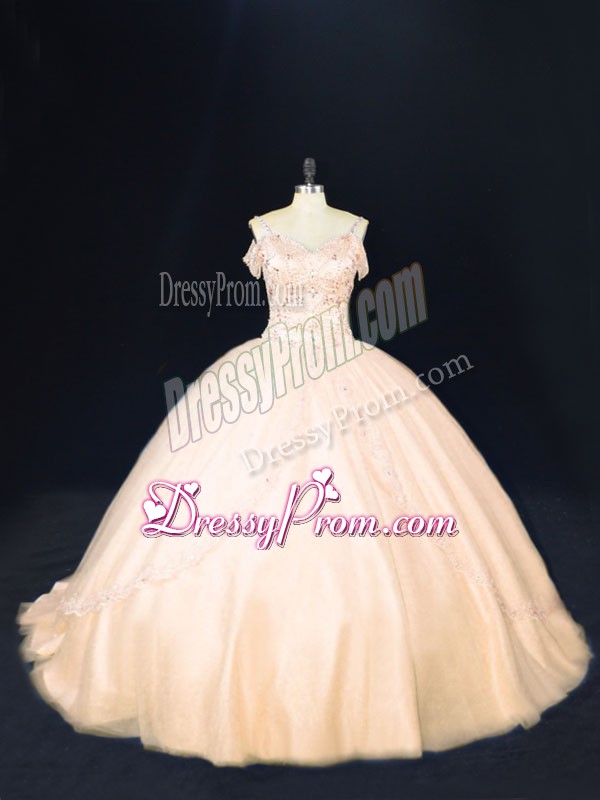 Neckline : Off the shoulderShown Color : PeachSilhouette : Ball GownsSleeve Length : sleevelessBack Detail : ZipperFabric : TulleEmbellishment : BeadingOccasion : Sweet 16,QuinceaneraSeason : Spring,Summer,Fall,Winter