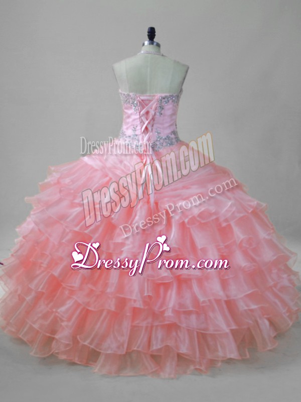 Neckline : Halter topShown Color : Pink Silhouette : Ball GownsSleeve Length : sleevelessHemline : floor lengthBack Detail : Lace upFabric : OrganzaEmbellishment : Beading,Ruffled LayersOccasion : Sweet 16,QuinceaneraSeason : Spring,Summer,Fall,Winter