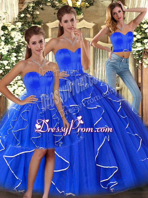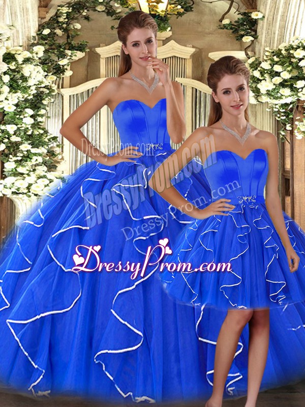 Neckline : SweetheartShown Color : BlueSilhouette : Two PiecesSleeve Length : sleevelessHemline : floor lengthBack Detail : Lace upFabric : TulleEmbellishment : RufflesOccasion : Sweet 16,QuinceaneraSeason : Spring,Summer,Fall,Winter