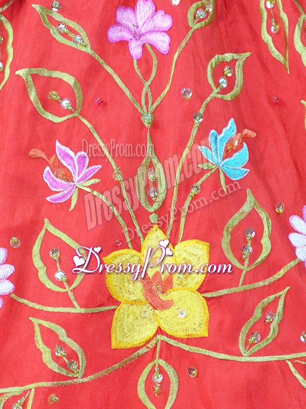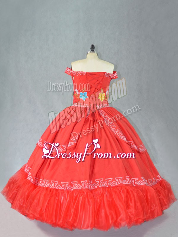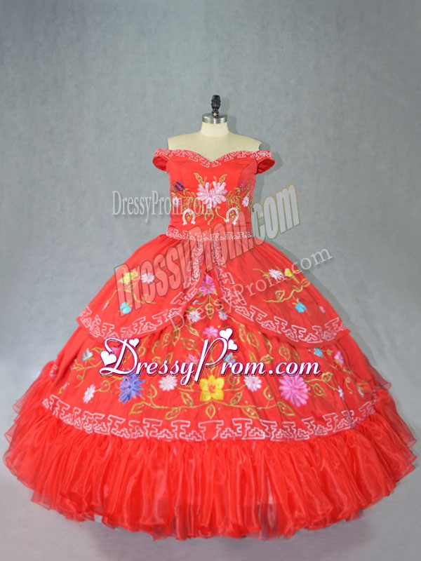 Neckline : Off the shoulderShown Color : RedSilhouette : Ball GownsSleeve Length : sleevelessHemline : floor lengthBack Detail : Lace upFabric : SatinEmbellishment : EmbroideryOccasion : Sweet 16,QuinceaneraSeason : Summer,Fall,Winter