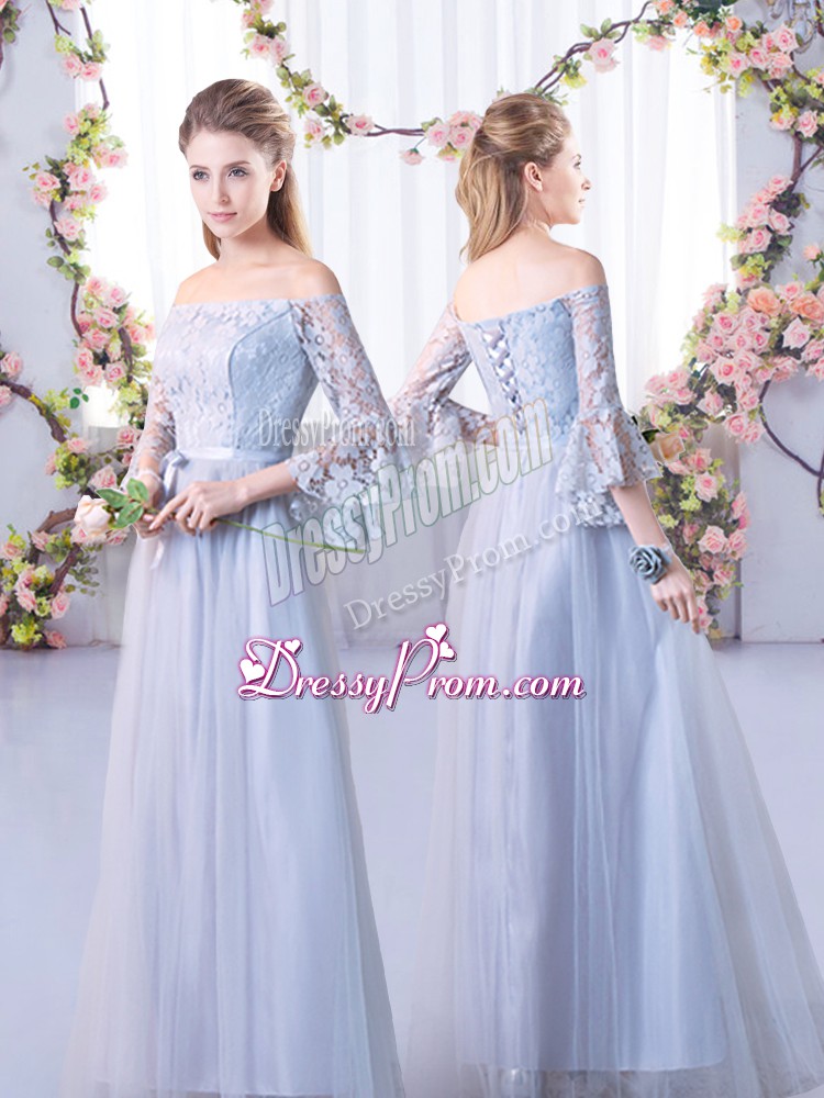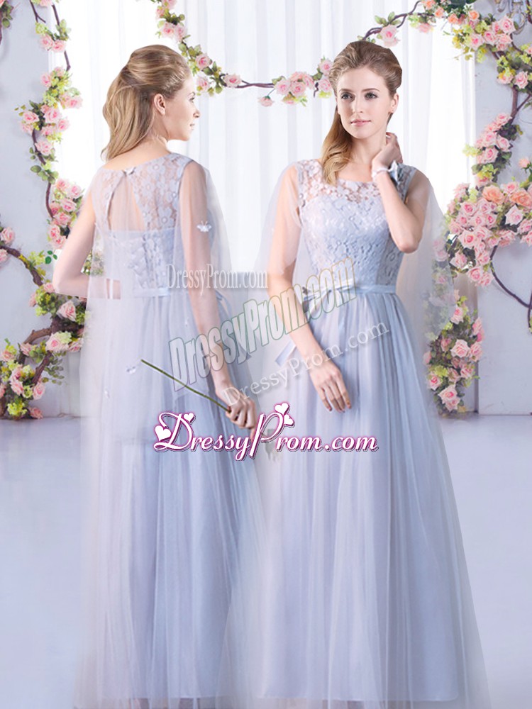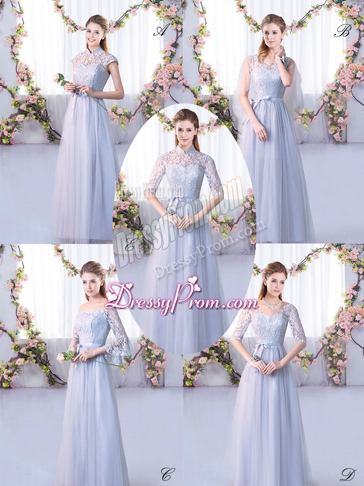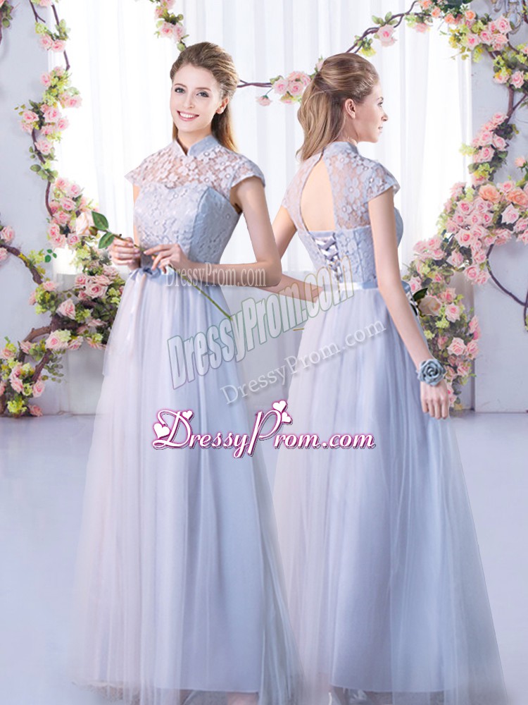 Neckline : High-neckShown Color : GreySilhouette : EmpireSleeve Length : cap sleevesHemline : floor lengthBack Detail : Lace upFabric : TulleEmbellishment : LaceOccasion : Wedding PartySeason : Spring,Summer,Fall,Winter