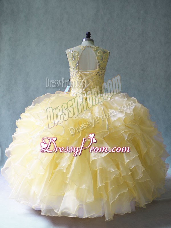 Neckline : ScoopShown Color : YellowSilhouette : Ball GownsSleeve Length : sleevelessHemline : floor lengthBack Detail : Lace upFabric : OrganzaEmbellishment : Beading,RufflesOccasion : Sweet 16,QuinceaneraSeason : Spring,Summer,Fall,Winter