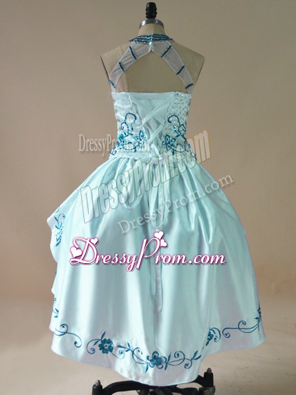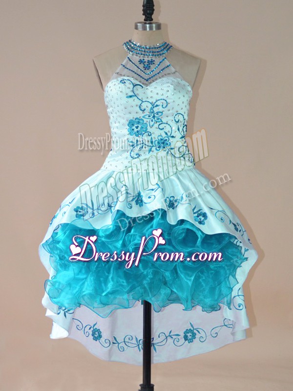 Neckline : High-neckShown Color : Aqua BlueSilhouette : Ball GownsSleeve Length : sleevelessHemline : high lowBack Detail : Lace upFabric : Satin,OrganzaEmbellishment : Embroidery,RufflesOccasion : Prom,PartySeason : Spring,Summer,Fall