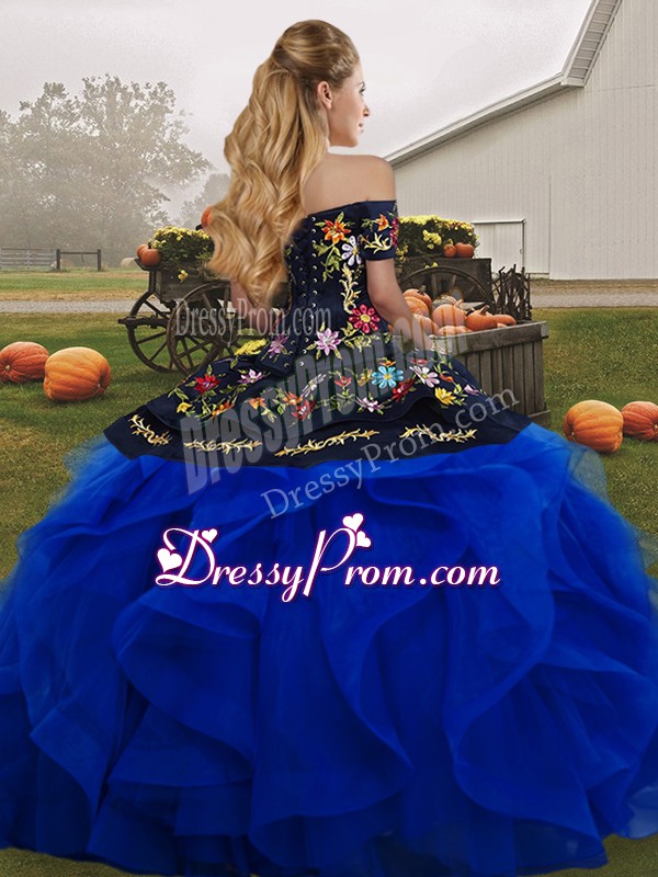 Neckline : Off the shoulder Shown Color : Red And Black Silhouette : Ball Gowns Sleeve Length : sleeveless Hemline : floor length Back Detail : Lace up Fabric : Tulle Embellishment : Embroidery,Ruffles Occasion : Military Ball,Sweet 16,Quinceanera Season : Spring,Summer,Fall,Winter