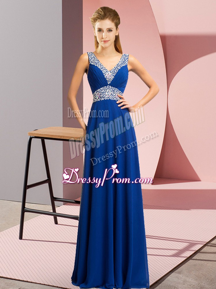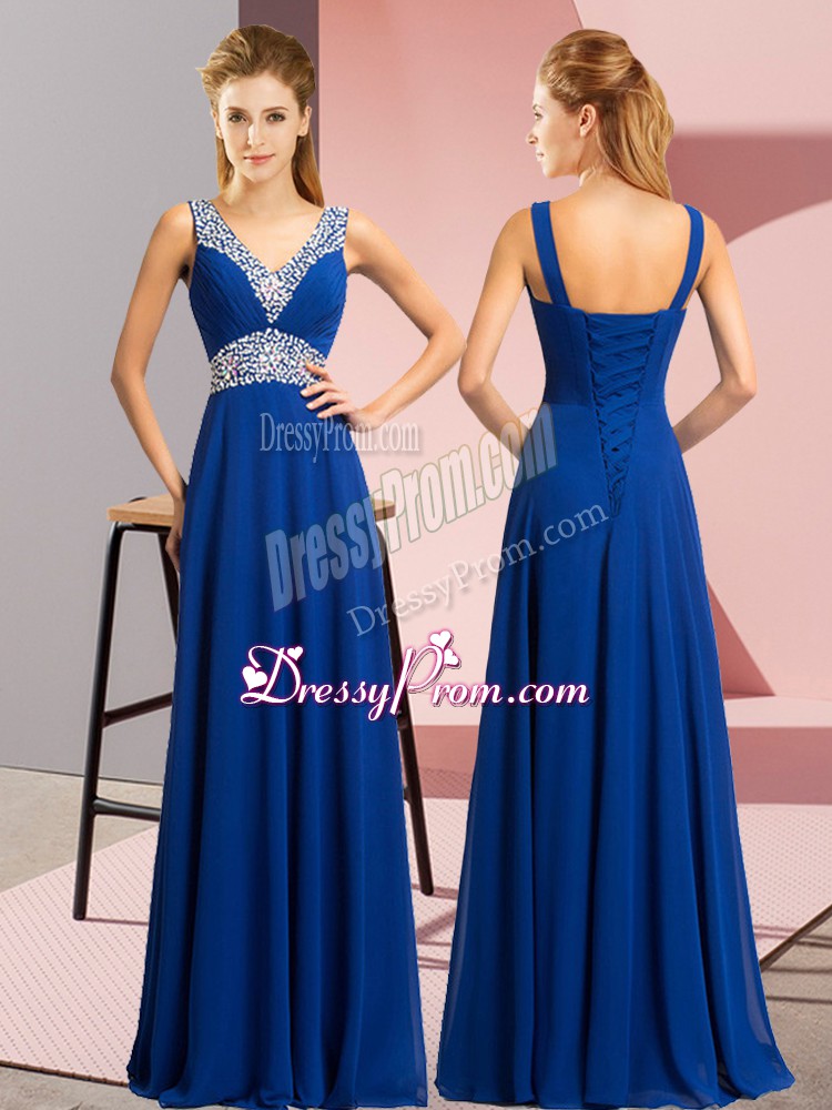 Neckline : V-neckShown Color : Royal BlueSilhouette : EmpireSleeve Length : sleevelessHemline : floor lengthBack Detail : Lace upFabric : ChiffonEmbellishment : BeadingOccasion : Prom,PartySeason : Spring,Summer,Fall,Winter