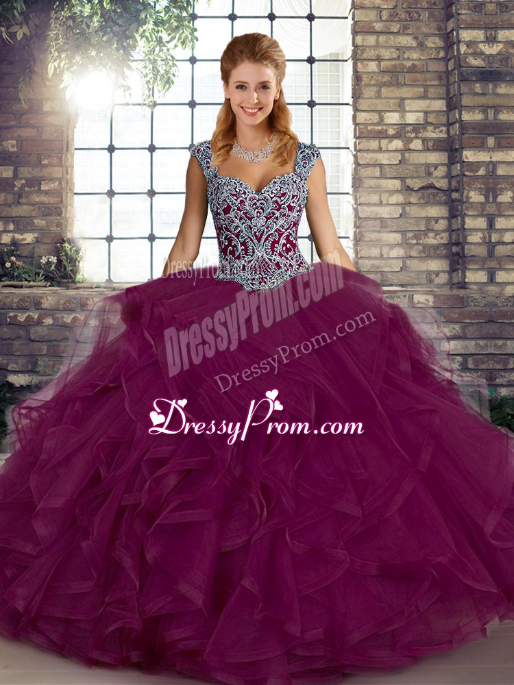 Neckline : StrapsShown Color : FuchsiaSilhouette : Ball GownsSleeve Length : sleevelessHemline : floor lengthBack Detail : Lace upFabric : TulleEmbellishment : Beading,RufflesOccasion : Military Ball,Sweet 16,QuinceaneraSeason : Spring,Summer,Fall,Winter