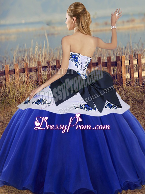 Neckline : SweetheartShown Color : TurquoiseSilhouette : Ball GownsSleeve Length : sleevelessHemline : floor lengthBack Detail : Lace upFabric : TulleEmbellishment : Embroidery,BowknotOccasion : Military Ball,Sweet 16,QuinceaneraSeason : Spring,Summer,Fall,Winter