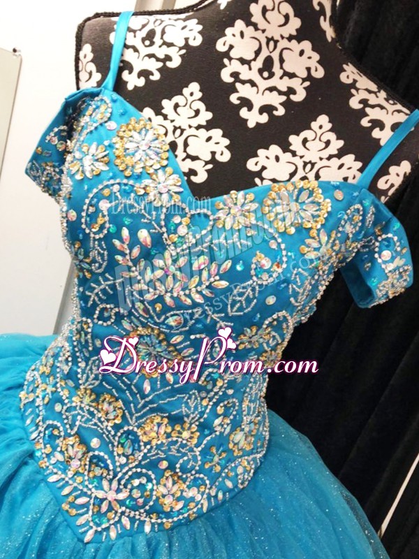Neckline : StrapsShown Color : Baby BlueSilhouette : Ball GownsSleeve Length : sleevelessHemline : floor lengthBack Detail : Lace upFabric : TulleEmbellishment : BeadingOccasion : Sweet 16,QuinceaneraSeason : Spring,Summer,Fall