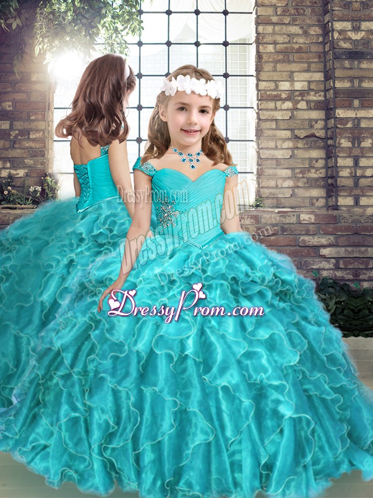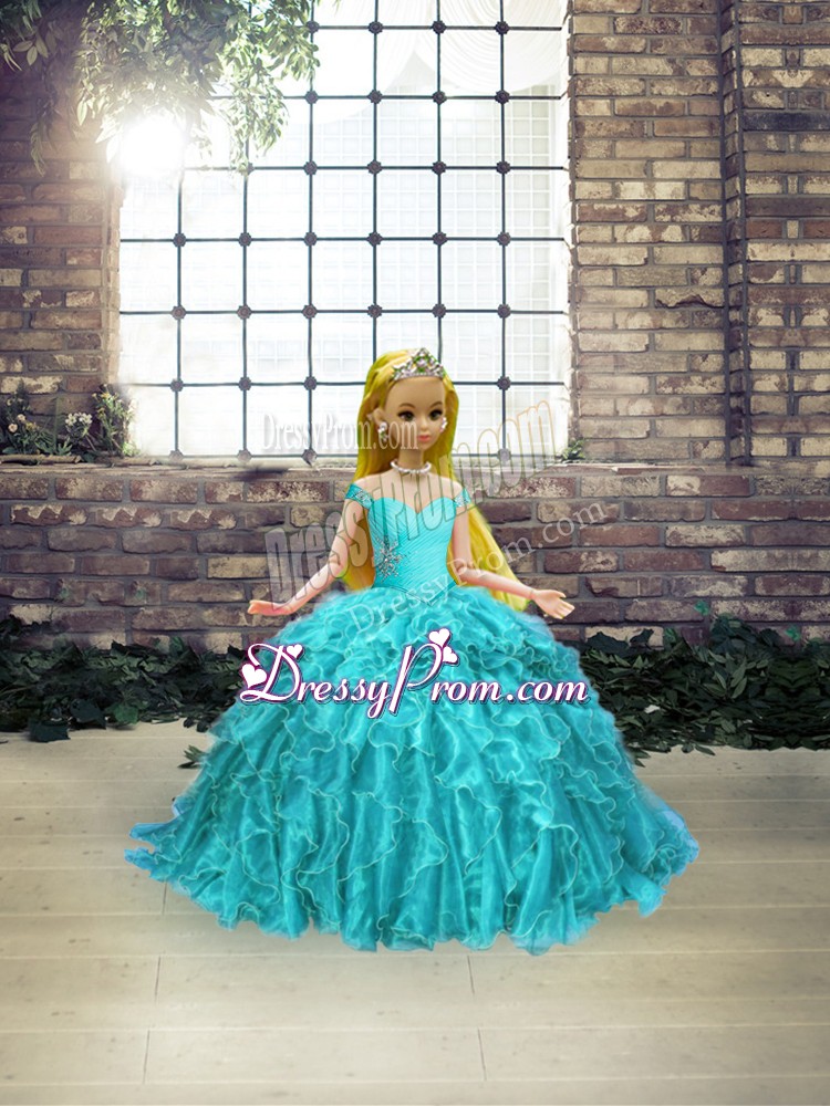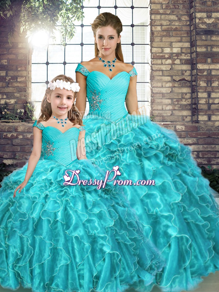 Neckline : Off the shoulder Shown Color : Aqua Blue Silhouette : Ball Gowns Sleeve Length : sleeveless Back Detail : Lace up Fabric : Organza Embellishment : Beading,Ruffles Occasion : Military Ball,Sweet 16,Quinceanera Season : Spring,Summer,Fall,Winter