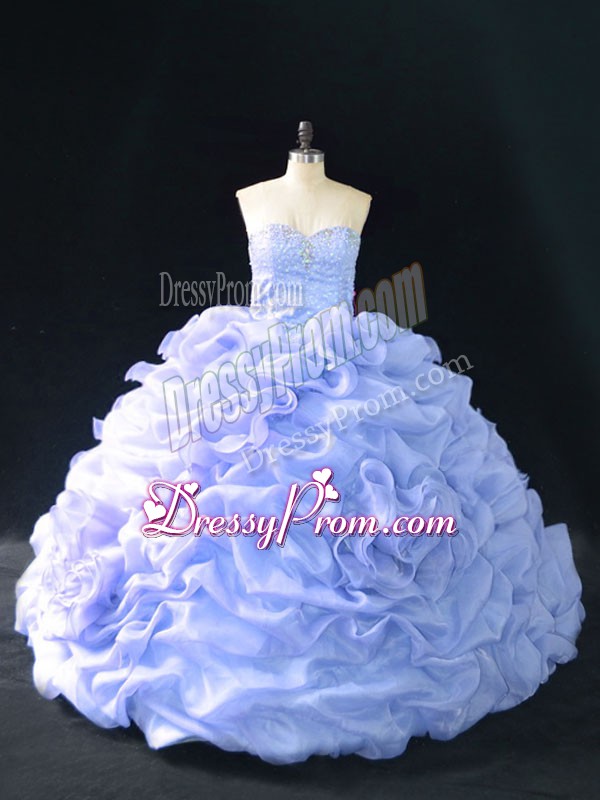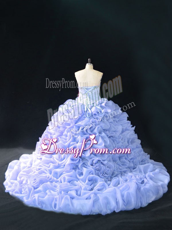 Neckline : SweetheartShown Color : LavenderSilhouette : Ball GownsSleeve Length : sleevelessBack Detail : Lace upFabric : OrganzaEmbellishment : Embroidery,Pick Ups,Hand Made FlowerOccasion : Sweet 16,QuinceaneraSeason : Spring,Summer,Fall,Winter