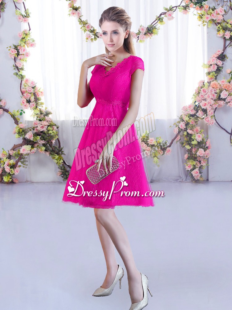 Neckline : V-neck Shown Color : Hot Pink Silhouette : A-line Sleeve Length : cap sleeves Hemline : mini length Back Detail : Lace up Fabric : Lace Embellishment : Lace Occasion : Wedding Party Season : Spring,Summer,Fall