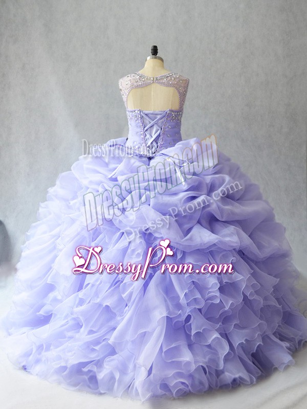 Neckline : ScoopShown Color : LilacSilhouette : Ball GownsSleeve Length : sleevelessBack Detail : Lace upFabric : OrganzaEmbellishment : Beading,RufflesOccasion : Sweet 16,QuinceaneraSeason : Spring,Summer,Fall,Winter