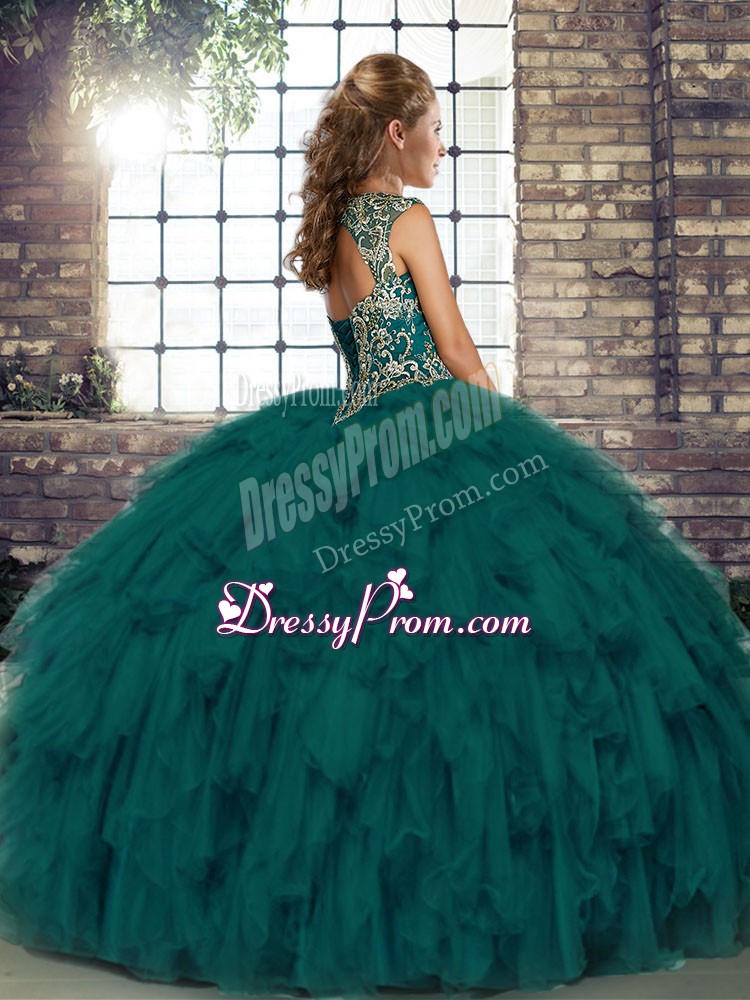 Neckline : StrapsShown Color : Peacock GreenSilhouette : Ball GownsSleeve Length : sleevelessHemline : floor lengthBack Detail : Lace upFabric : OrganzaEmbellishment : Beading,RufflesOccasion : Military Ball,Sweet 16,QuinceaneraSeason : Spring,Summer,Fall,Winter