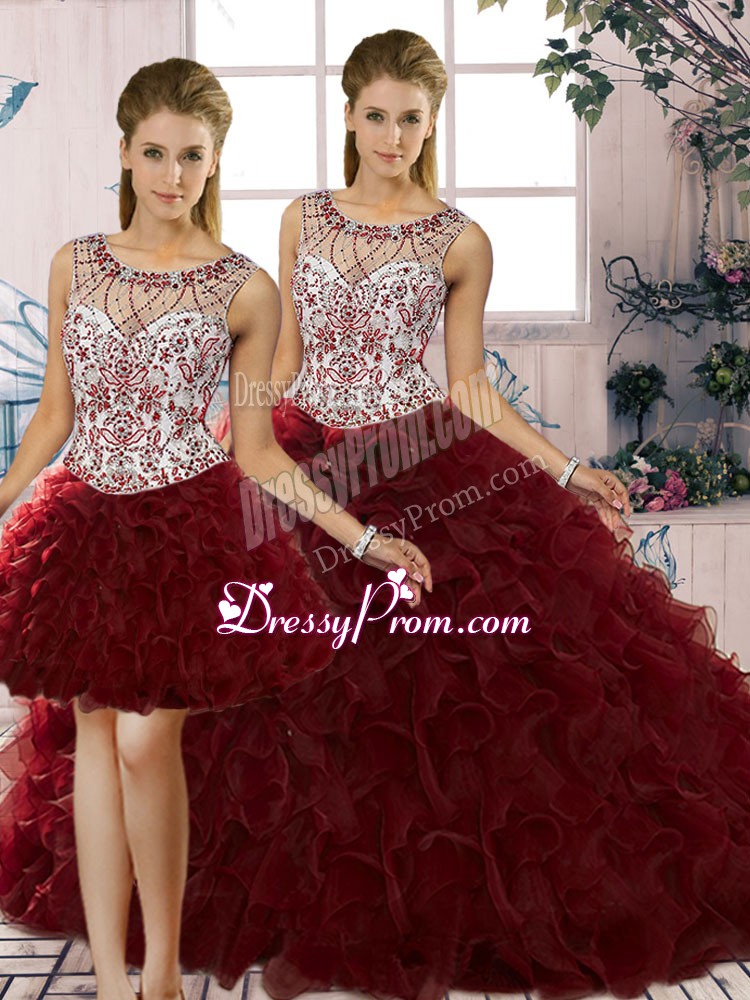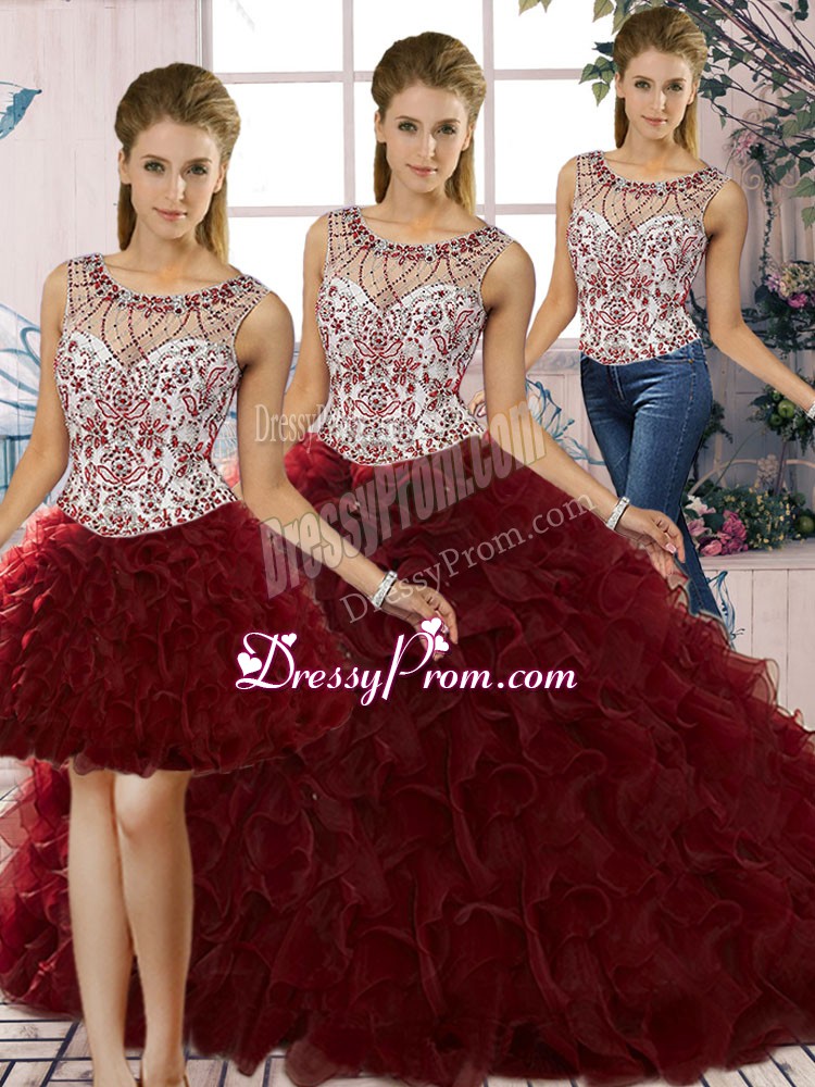 Neckline : ScoopShown Color : BurgundySilhouette : Three PiecesSleeve Length : sleevelessHemline : floor lengthBack Detail : Lace upFabric : OrganzaEmbellishment : Beading,RufflesOccasion : Military Ball,Sweet 16,QuinceaneraSeason : Spring,Summer,Fall,Winter