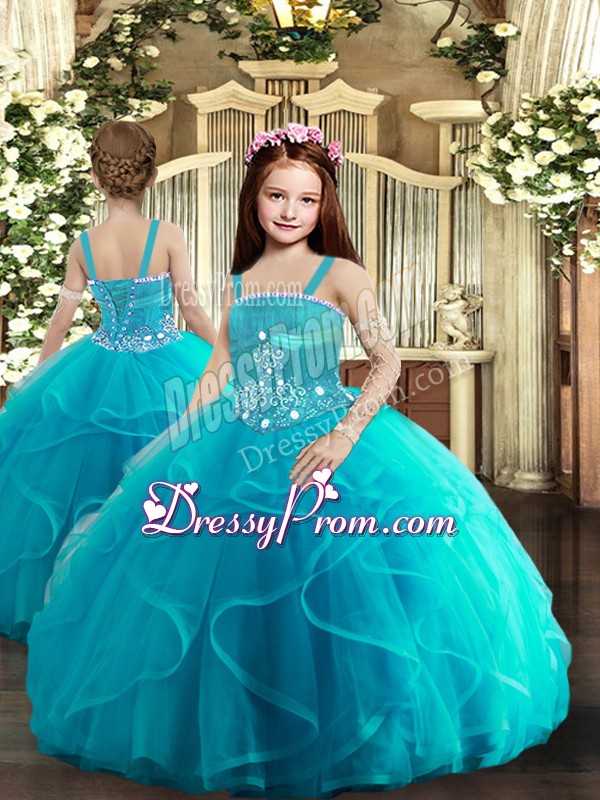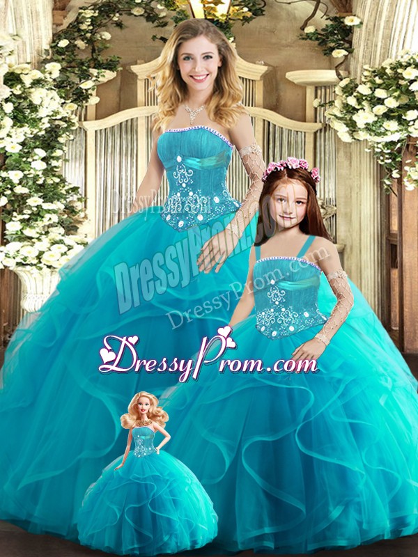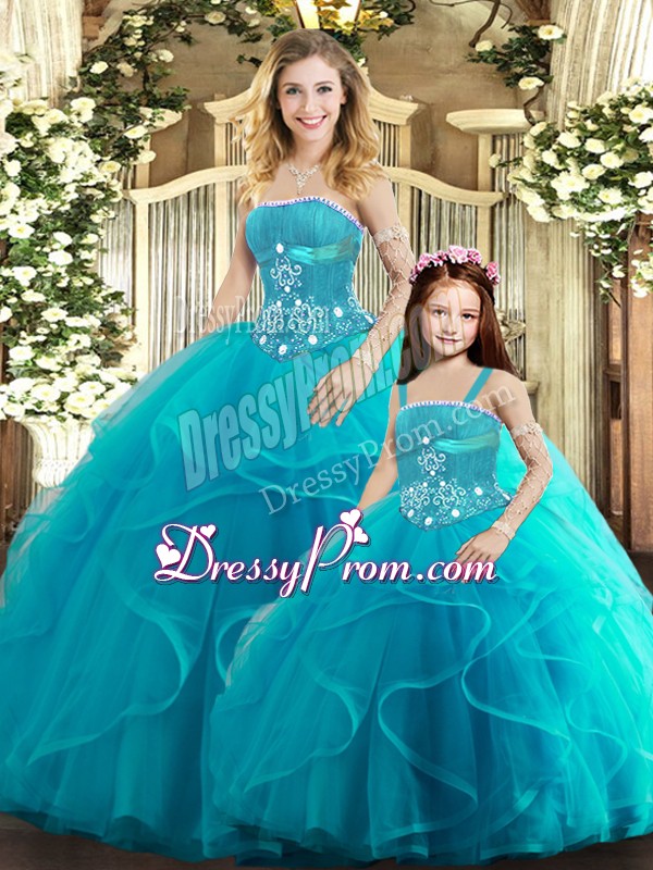 Neckline : StraplessShown Color : Aqua BlueSilhouette : Ball GownsSleeve Length : sleevelessHemline : floor lengthBack Detail : Lace upFabric : TulleEmbellishment : Beading,RufflesOccasion : Sweet 16,QuinceaneraSeason : Spring,Summer,Fall,Winter