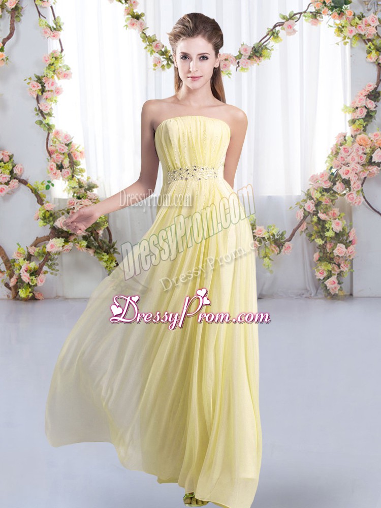 Neckline : StraplessShown Color : YellowSilhouette : EmpireSleeve Length : sleevelessBack Detail : Lace upFabric : ChiffonEmbellishment : BeadingOccasion : Wedding PartySeason : Spring,Summer,Fall,Winter