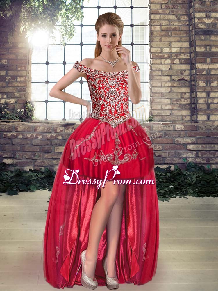 Neckline : Off the shoulder Shown Color : Red Silhouette : Ball Gowns Sleeve Length : sleeveless Hemline : floor length Back Detail : Lace up Fabric : Tulle Embellishment : Beading,Embroidery Occasion : Military Ball,Sweet 16,Quinceanera Season : Spring,Summer,Fall,Winter