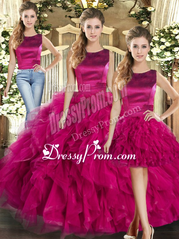 Neckline : ScoopShown Color : FuchsiaSilhouette : Three PiecesSleeve Length : sleevelessHemline : floor lengthBack Detail : Lace upFabric : TulleEmbellishment : RufflesOccasion : Military Ball,Sweet 16,QuinceaneraSeason : Spring,Summer,Fall,Winter