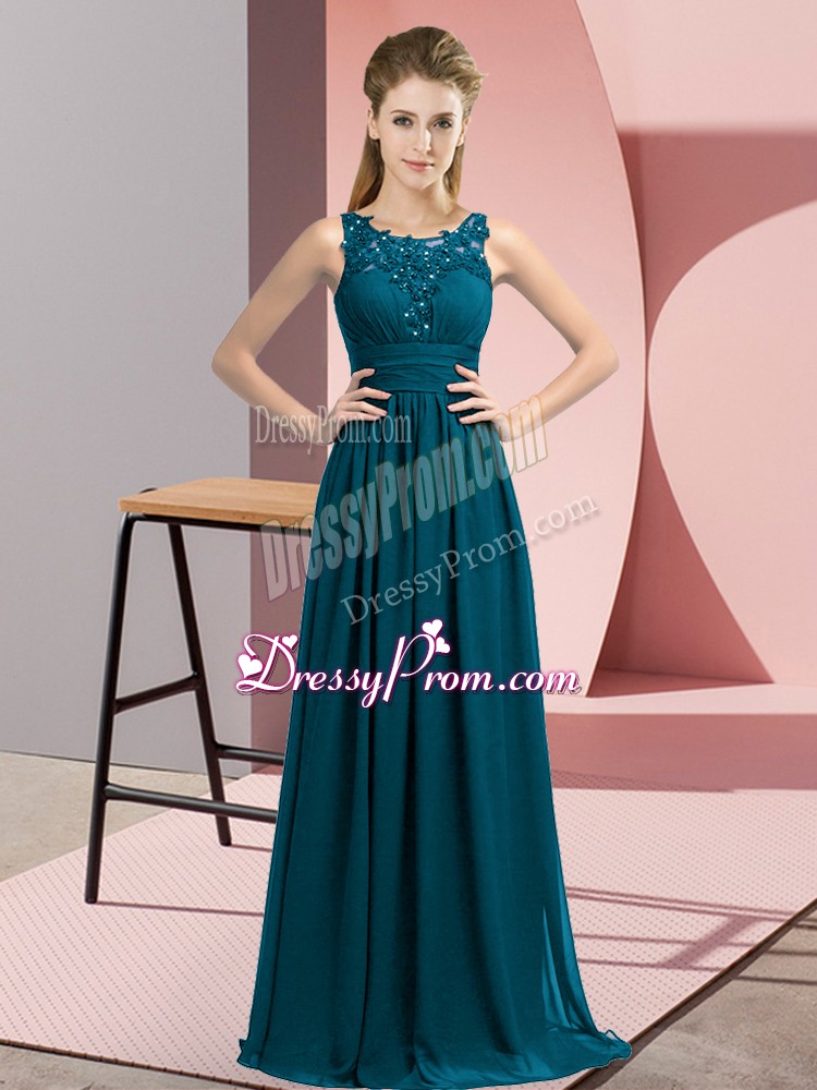 Neckline : ScoopShown Color : Teal Silhouette : EmpireSleeve Length : sleevelessHemline : floor lengthBack Detail : ZipperFabric : ChiffonEmbellishment : Beading,AppliquesOccasion : Wedding PartySeason : Spring,Summer,Fall,Winter