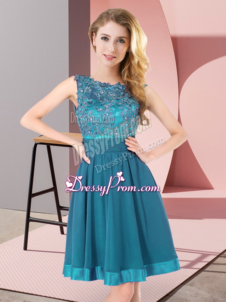Neckline : ScoopShown Color : Teal Silhouette : EmpireSleeve Length : sleevelessHemline : mini lengthBack Detail : BacklessFabric : ChiffonEmbellishment : Beading,AppliquesOccasion : Wedding PartySeason : Spring,Summer,Fall