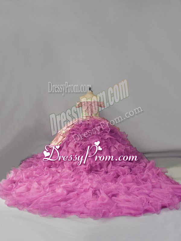 Neckline : Off the shoulderShown Color : LilacSilhouette : Ball GownsSleeve Length : sleevelessBack Detail : Lace upFabric : OrganzaEmbellishment : Embroidery,RufflesOccasion : Sweet 16,QuinceaneraSeason : Spring,Summer,Fall,Winter