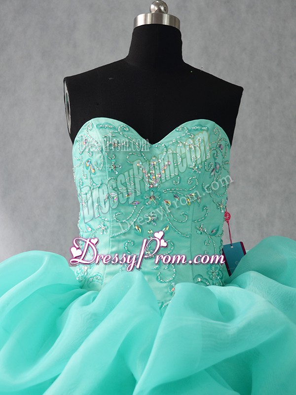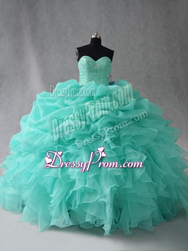 Neckline : SweetheartShown Color : Aqua BlueSilhouette : Ball GownsSleeve Length : sleevelessHemline : floor lengthBack Detail : Lace upFabric : OrganzaEmbellishment : Beading,Ruffles,Pick UpsOccasion : Sweet 16,QuinceaneraSeason : Spring,Summer,Fall,Winter