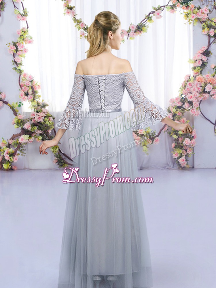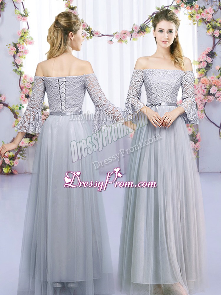 Neckline : Off the shoulderShown Color : GreySilhouette : EmpireSleeve Length : 3|4 length sleeveHemline : floor lengthBack Detail : Lace upFabric : TulleEmbellishment : Lace,BeltOccasion : Wedding PartySeason : Spring,Summer,Fall,Winter