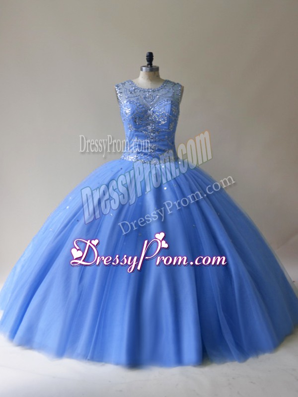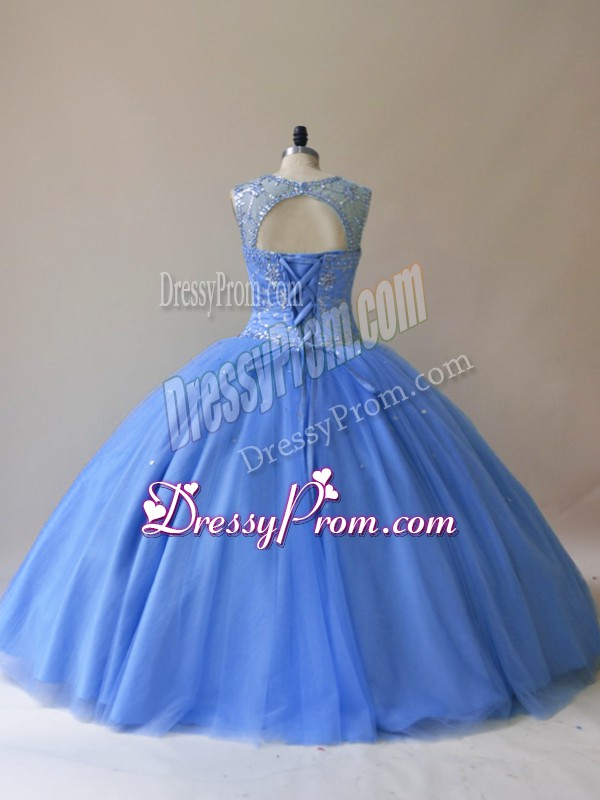 Neckline : ScoopShown Color : Baby BlueSilhouette : Ball GownsSleeve Length : sleevelessHemline : floor lengthBack Detail : Lace upFabric : TulleEmbellishment : BeadingOccasion : Sweet 16,QuinceaneraSeason : Spring,Summer,Fall,Winter