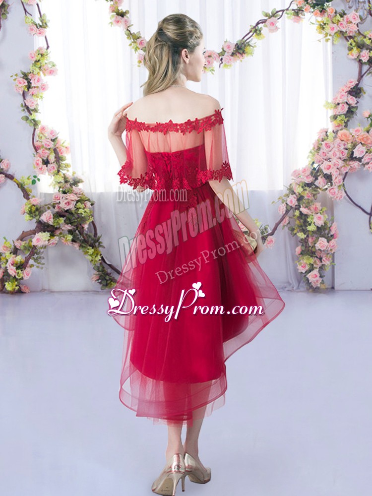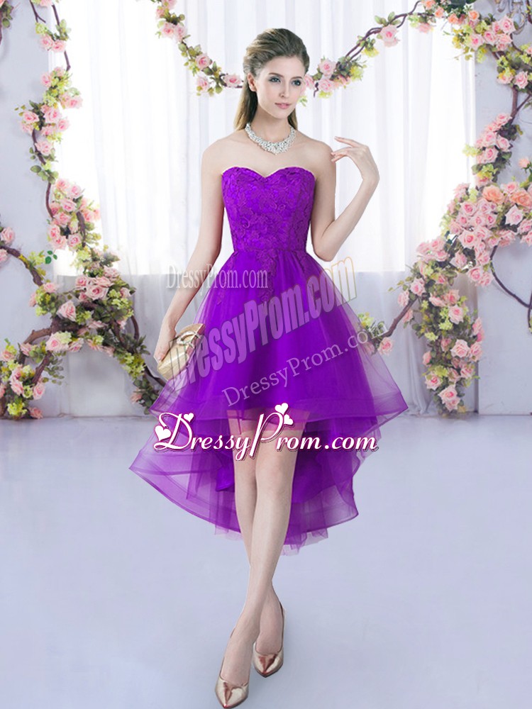 Neckline : SweetheartShown Color : Eggplant PurpleSilhouette : A-lineSleeve Length : sleevelessHemline : high lowBack Detail : Lace upFabric : TulleEmbellishment : LaceOccasion : Wedding PartySeason : Spring,Summer,Fall,Winter