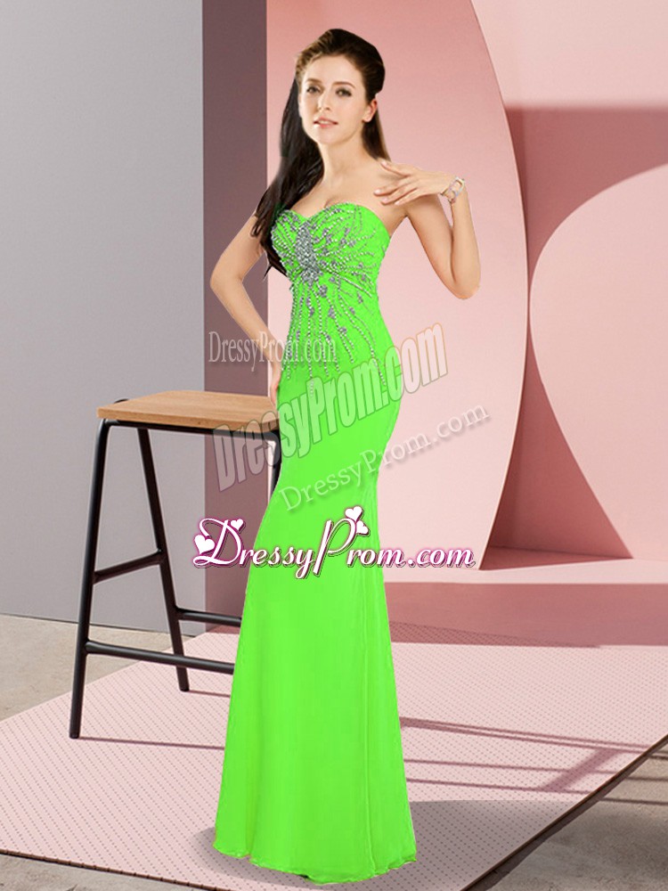 Neckline : SweetheartShown Color : Spring GreenSilhouette : Column/SheathSleeve Length : sleevelessHemline : floor lengthBack Detail : ZipperFabric : ChiffonEmbellishment : BeadingOccasion : Prom,PartySeason : Spring,Summer,Fall,Winter