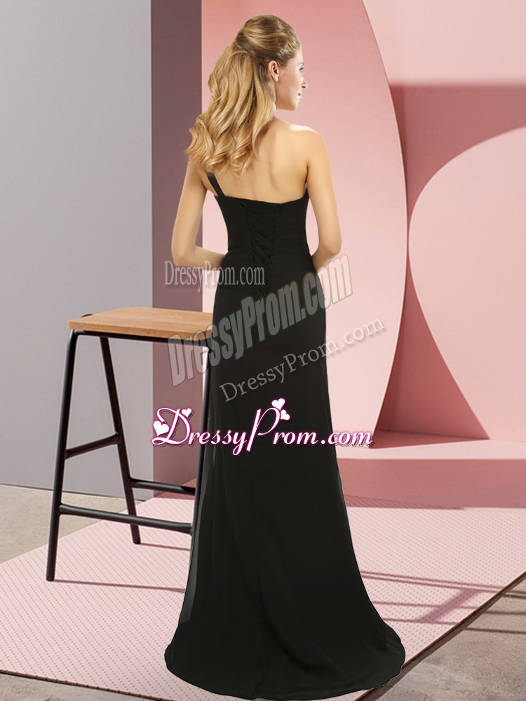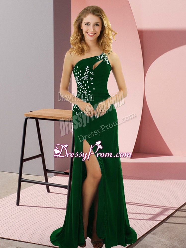 Suitable Dark Green Column/Sheath Elastic Woven Satin One Shoulder Sleeveless Beading Lace Up Sweep Train